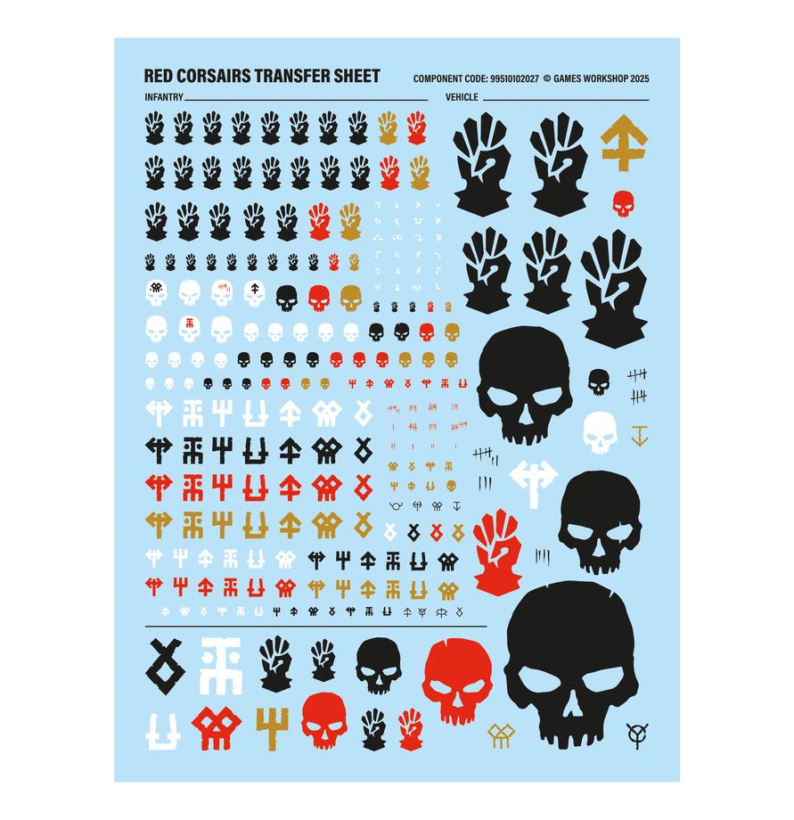 Zestaw zawiera 1 arkusz naklejek Red Corsairs z 248 wysokiej jakości naklejkami wodnymi. Znajdują się wśród nich naklejki przedstawiające piechotę i pojazdy z motywami Red Corsairs, czaszkami, liczbą zabitych i innymi przeklętymi symbolami.